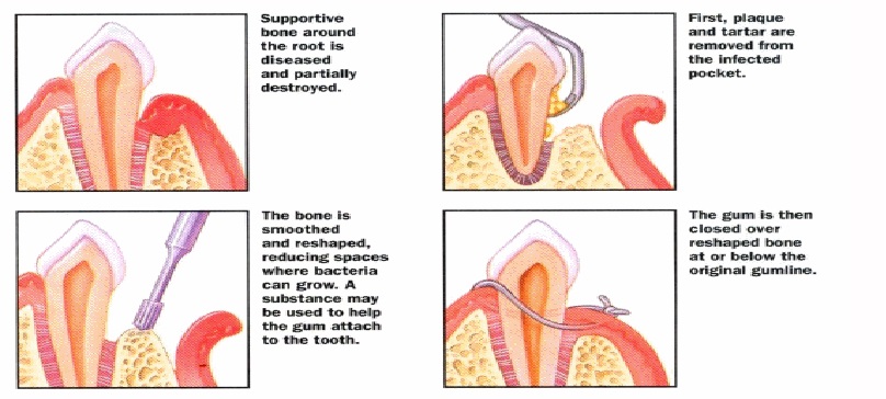 Pocket reduction surgery is a collective term for a series of several different surgeries aimed at gaining access to the roots of the teeth in order to remove bacteria and tartar (calculus). The human mouth contains dozens of different bacteria at any given time. The bacteria found in plaque produce acids that lead to demineralization of the tooth surface, and ultimately contribute to periodontal disease. Periodontal infections cause a chronic inflammatory response in the body that literally destroys bone and gum tissues once they invade the subgingival area . Gum pockets form and deepen between the gums and teeth as the tissue continues to be destroyed.
